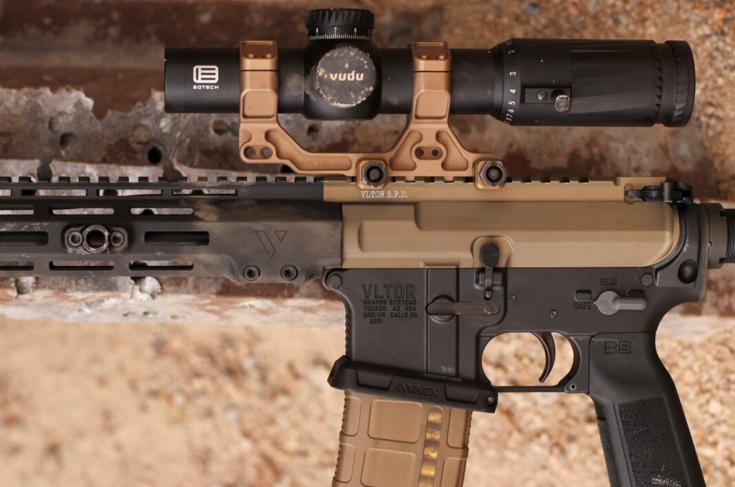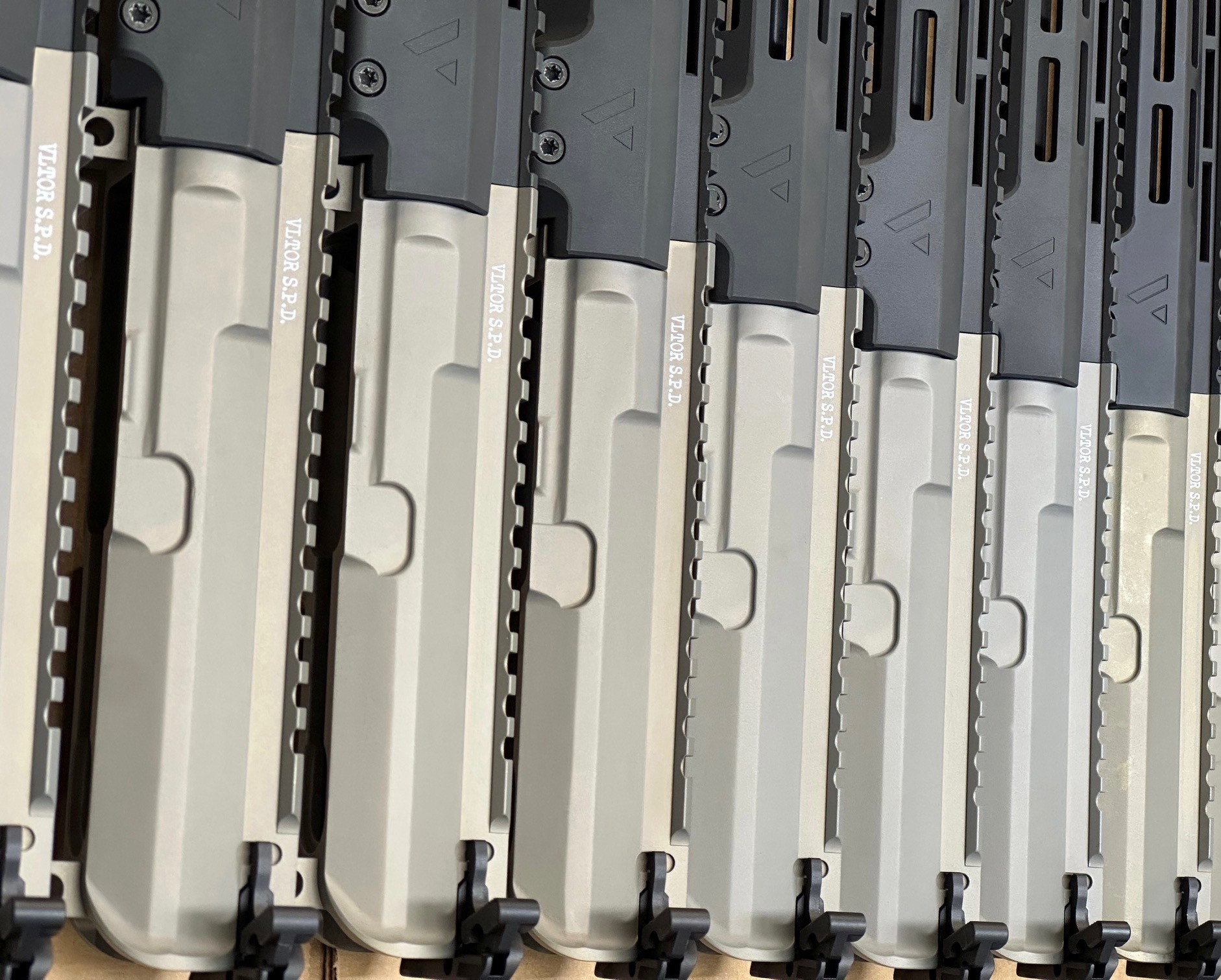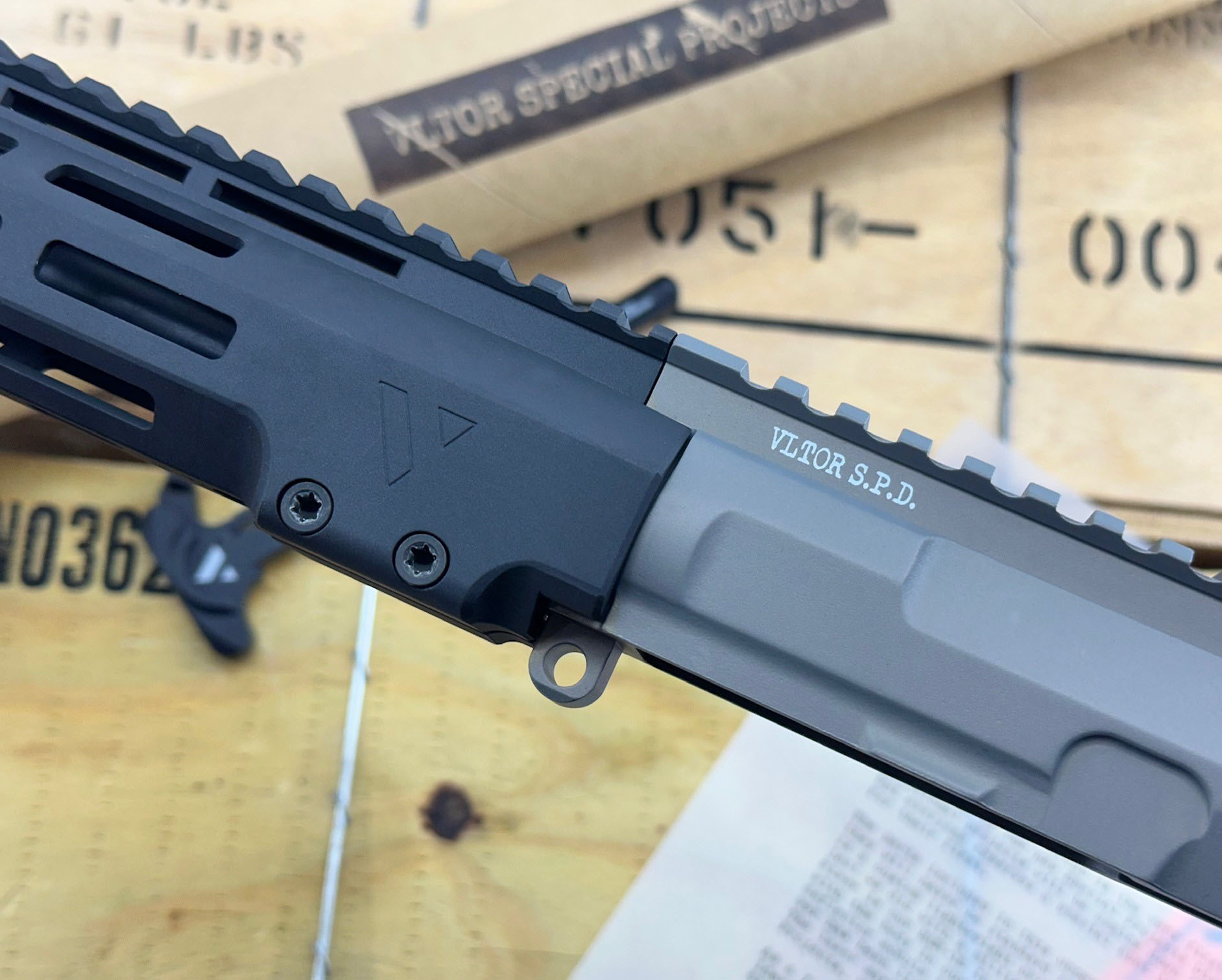 *VLTOR MUR-1S Upper Receiver, in custom two-tone configuration. Machined from custom 7075 Forging. M4 feedramps. No forward assist. Receiver body is in undyed “Null” hardcoat ano, deflector module is black hardcoat .